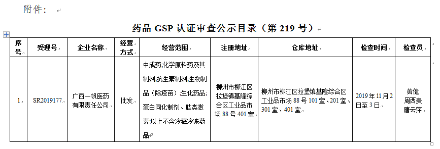 根据《药品经营质量管理规范认证管理办法》的规定,经现场检查和审核,广西一帆医药有限责任公司符合《药品经营质量管理规范》(国家食品药品监督管理总局令第28号)要求,现予公示。公示期5日,自2019年11月15日至2019年11月19日。