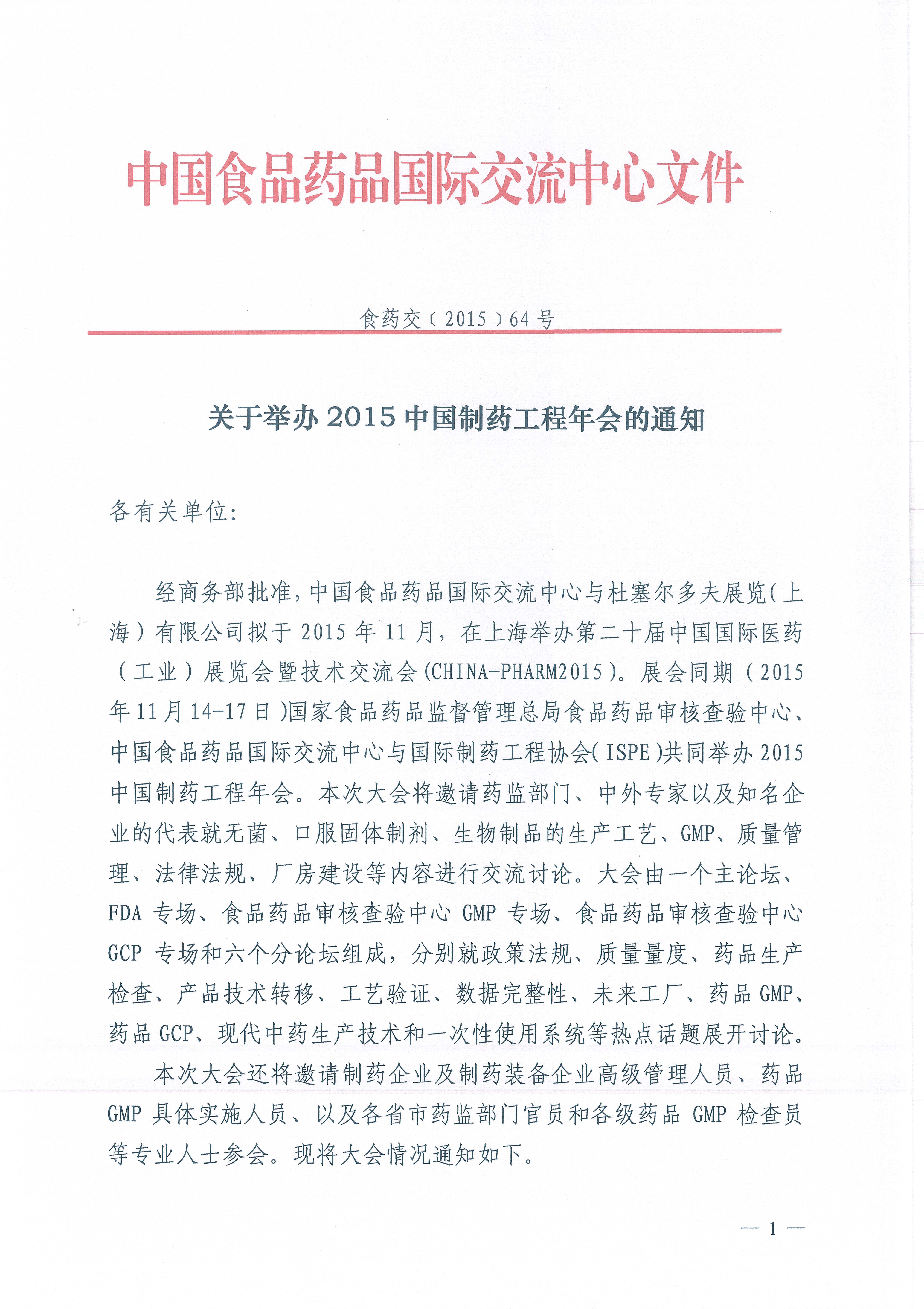 中国食品药品国际交流中心关于举办2015年中国制药工程年会的通知