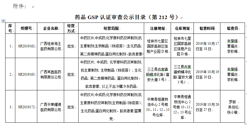 附件:药品GSP认证审查公示目录(第212号)
