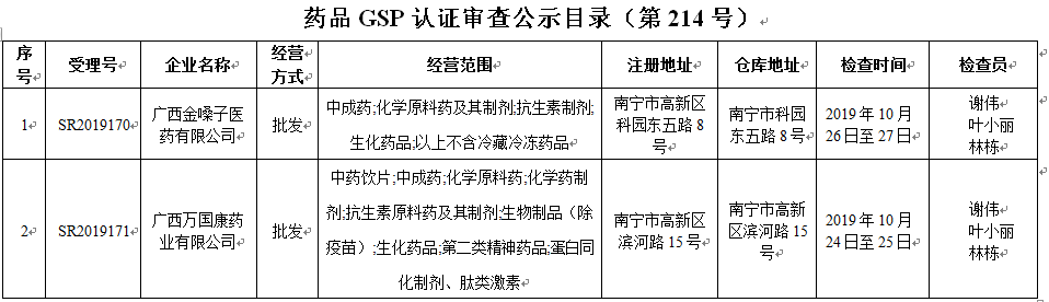 附件:药品GSP认证审查公示目录(第214号)