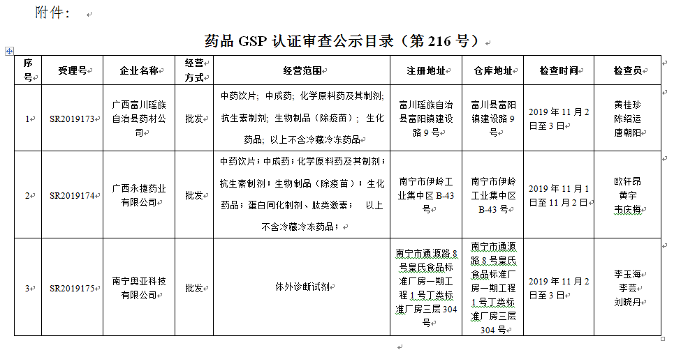 附件:药品GSP认证审查公示目录(第216号)