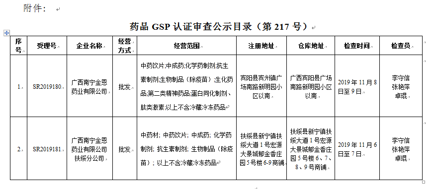 根据《药品经营质量管理规范认证管理办法》的规定,经现场检查和审核,广西南宁金恩药业有限公司和广西南宁金恩药业有限公司扶绥分公司符合《药品经营质量管理规范》(国家食品药品监督管理总局令第28号)要求,现予公示。公示期5日,自2019年11月13日至2019年11月17日。