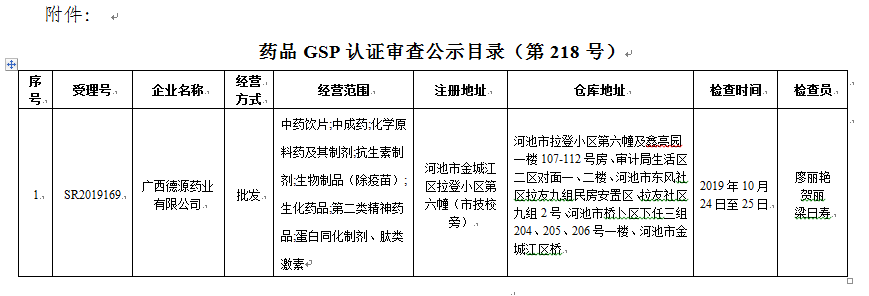 根据《药品经营质量管理规范认证管理办法》的规定,经现场检查和审核,广西德源药业有限公司符合《药品经营质量管理规范》(国家食品药品监督管理总局令第28号)要求,现予公示。公示期5日,自2019年11月14日至2019年11月18日。