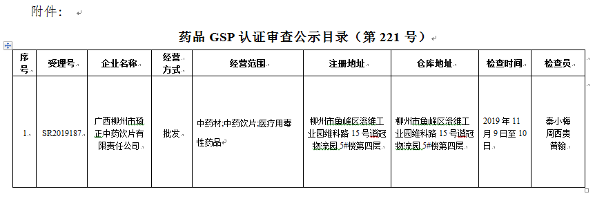 根据《药品经营质量管理规范认证管理办法》的规定,经现场检查和审核,广西柳州市琦正中药饮片有限责任公司符合《药品经营质量管理规范》(国家食品药品监督管理总局令第28号)要求,现予公示。公示期5日,自2019年11月19日至2019年11月23日。