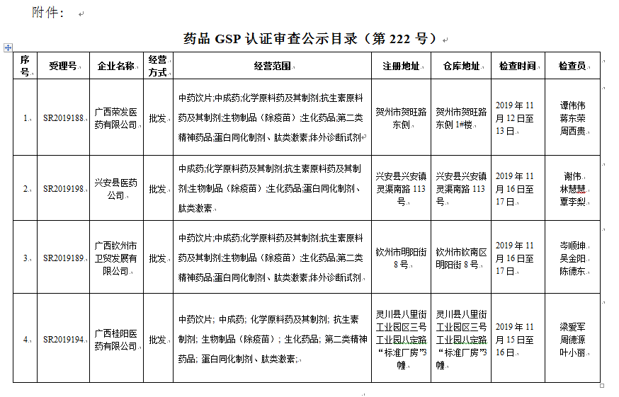 附件:药品GSP认证审查公示目录(第222号)
