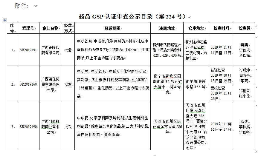 根据《药品经营质量管理规范认证管理办法》的规定,经现场检查和审核,广西正隆医药有限公司、广西医保贸易有限责任公司、广西河池柳药药业有限公司、广西梧州市中恒医药有限公司和桂林康博医药贸易有限公司等5家企业符合《药品经营质量管理规范》(国家食品药品监督管理总局令第28号)要求,现予公示。公示期5日,自2019年11月28日至2019年12月2日。