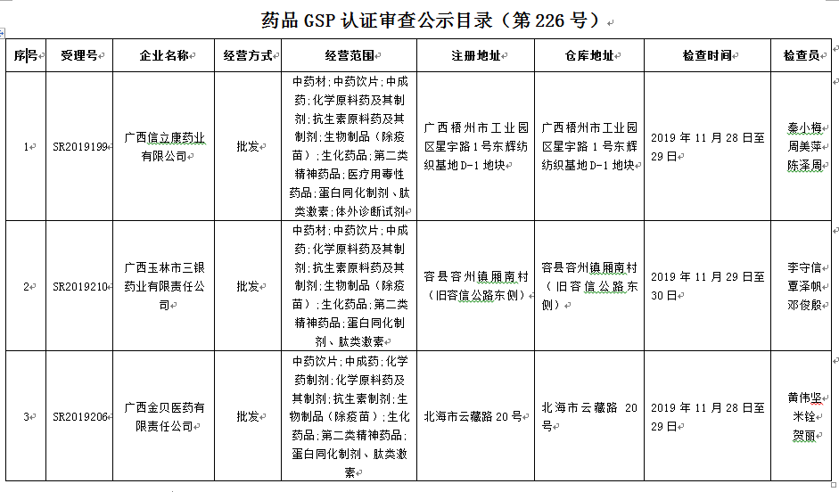 附件:药品GSP认证审查公示目录(第226号)
